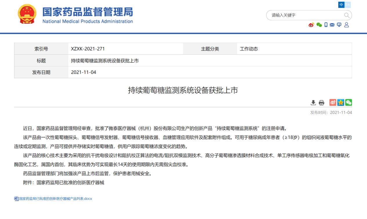11月4日,据国家药品监督管理局发布——微泰医疗AiDEX G7持续葡萄糖监测系统获批上市!该系统由微泰医疗器械(杭州)股份有限公司自主研发。此产品的上市,标志着中国科技公司已成功打破国外企业技术壁垒,成为糖尿病监测领域的领导者之一。
