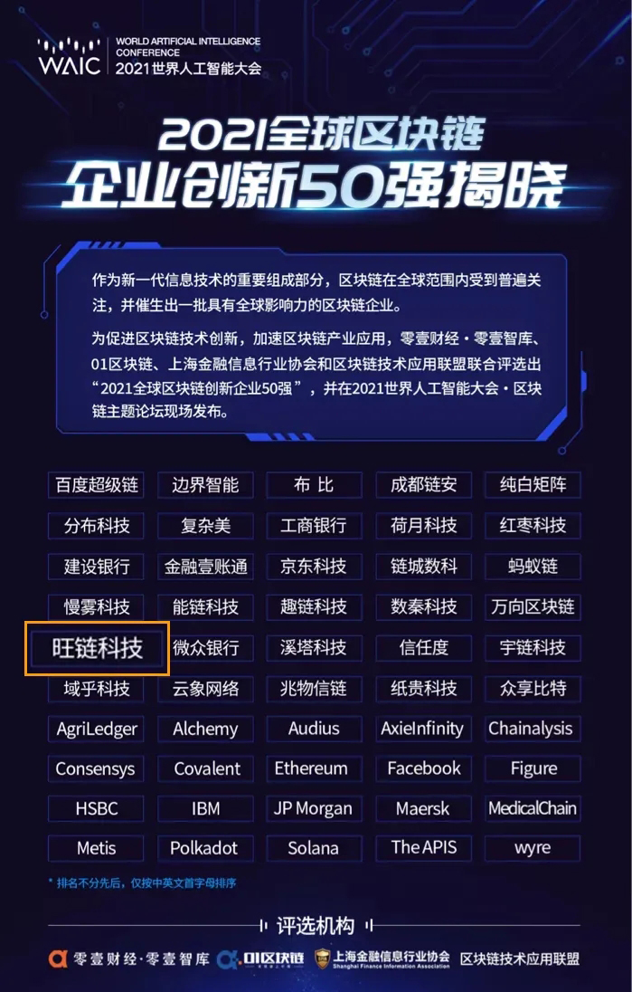 7月10日,以“链络全世界 智造新城市”为主题的世界人工智能大会-区块链分论坛成功召开。在论坛现场,上海金融信息行业协会联合行业研究机构发布了《2021全球区块链企业创新50强》榜单,旺链科技荣誉上榜。