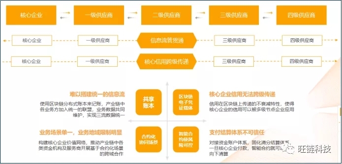 通过旺链科技VoneCredit平台,供应链上核心企业可以为其上游多层级供应商提供一种可流转、可融资、可拆分、可兑付的电子付款承诺凭证(到期支付货款的承诺函),使核心企业信用沿着可信的贸易链路传递,每级供应商对核心企业签发的凭证进行签收之后可根据真实的贸易背景,将其拆分、流转给上一级供应商。而在拆分、流转过程中,核心企业的背书效用不变。整个凭证的拆分、流转过程在平台上可存证可追溯,缩短了整个产业链的现金流量周期,降低产业资金成本,使金融行为穿透多个环节,做到可兑付、可融资。