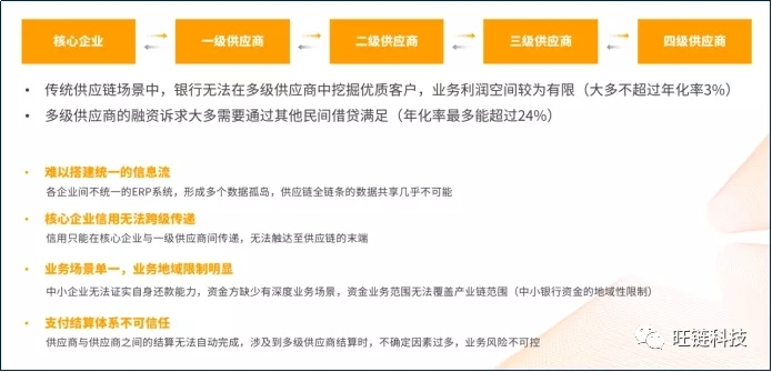 首先是银行出于风控考虑,仅愿意对供应链核心企业有直接应付款义务的上游一级供应商提供保理业务,或对其下游一级供应商提供预付款或者存货融资。这就导致了有巨大融资需求的下游供应商或经销商的需求无法得到满足,中小企业融资难融资贵的问题并不能得到很好地解决。