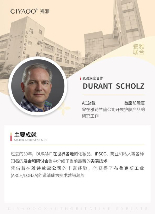 值得一提的是,公司特别邀约在探索皮肤生物领域,处于全球领先地位的雅诗兰黛公司的研发团队前核心成员Durant Scholz加入CIYAOO瓷雅实验室。