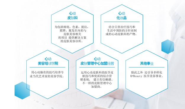 在中国也许你没有听说过韩国心动集团,但是在韩国,他是服务于作为大韩航空女乘务员俱乐部、三星集团、国民银行、 HUROM、VOKVIK、JIN AIR、韩进和韩华等多数企业的皮肤管理机构,同时更是韩国娱乐圈内知名的“皮肤管理主治医师活动”的倡导者,为FC MEN(演艺人足球队)、都熙、池贤宇、池昌旭、贤宇、SBS综艺节目等多数明星提供有效的皮肤护理与相关建议。大到正规皮肤科施术,小到面膜的有效用法,心动集团旗下的各个美容事业部,都在努力地倡导用正确的、健康的美容观念来带动皮肤自内而外的光彩质感。