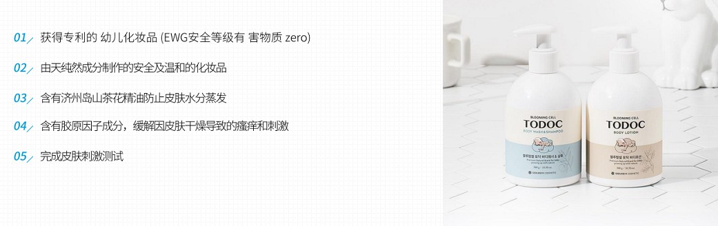 TODOC系列产品含有来自自然的成分, 对皮肤安全而无刺激,具有可柔和地净化柔弱皮肤的柔和而纯净的洗净力。具有深层保湿和皮肤镇定效果, 轻盈而清爽的日常保湿。 同时含有济州山茶油, 可补充丰富的水分和营养,神经酰胺 · 缩氨酸成分有助于缓解皮肤的干燥。